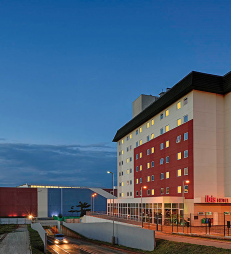 O hotel dispõe 132 aptos, estacionamento interno, restaurante e bar.